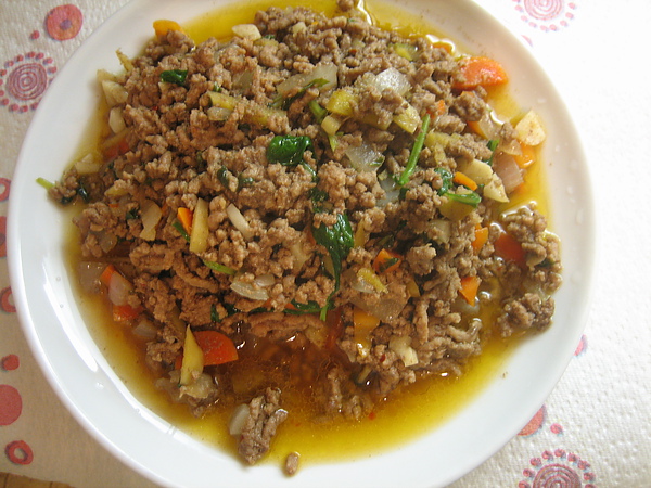 以下就是那盤加了太多 Habanero 的超辣打拋牛肉。黃黃的是碎薑,橘色的部份有的是紅蘿蔔,有的是 Habanero。