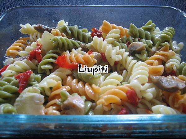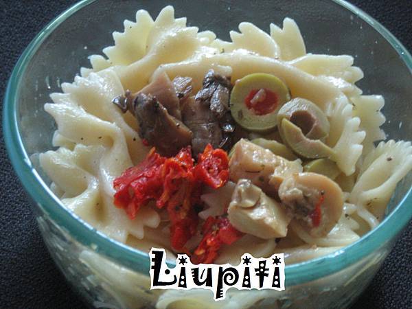 基本的義大利麵沙拉(pasta salad)作法如下:麵煮過後拌上初搾橄欖油(extra-virgin olive oil)、米醋、蒜末,上面再放上切過的食材(不想切也可以,只是我比較喜歡切過的大小和口感)。
