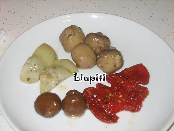 橄欖吧除了各種醃橄欖,還有很多地中海地區的涼菜,像是希臘葡萄葉卷(stuffed grape leaves,點這裡看相片,葡萄葉內包米飯或肉,吃起來軟軟、酸酸、涼涼的,每次都讓我想到小時候聽過那個關於宜蘭腔台語的順口溜:呷飯配滷卵,軟軟酸酸...),除此之外還有各式的義大利式醃紅椒、辣椒、漬番茄和漬蘑菇。