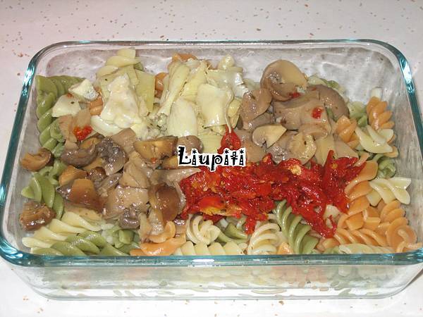 至於我發懶的時候(這是常態),則是用現成橄欖吧買的食材來拌麵,或是做成義大利麵沙拉(pasta salad)。下面這幾種食材從最上方開始順時鐘方向分別是:義大利香料油醋蘑菇、油漬番茄乾(marinated sun-dried tomatoes,番茄先在太陽底下曬乾後再用香料橄欖油醃過)、左下方是紅酒醋漬蘑菇,左邊那長得有點像滷筍絲的是醃朝鮮薊心(marinated artichoke heart)。這樣少少幾種食材要價美金四塊多,非常不便宜~