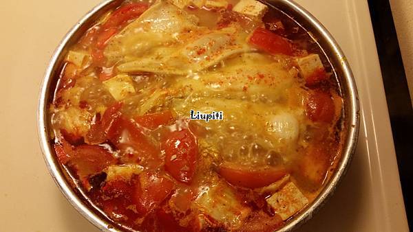我一開始只放了兩大片比目魚片、兩顆中型番茄、兩條細紅蘿蔔(切薄片)、一盒豆腐,七、八片白菜只放莖的部分,成品就像下面這張圖。